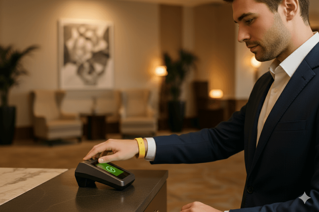 Guests pay using digital methods or NFC bracelets across the property.